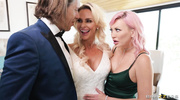 Прямо на свадьбе горячая и опытная милфа позволила своему жениху воспользоваться свидетельницей с розовыми волосами. Милфа не стала упускать такую возможность обильно кончить и сразу же набросилась на член чужого жениха. Хорошенько отработав ротиком, длинноногая сучка дала отыметь мокрую пилотку, а потом и тугую попку, пока невеста смотрела на происходящее из кресла и мастурбировала киску.